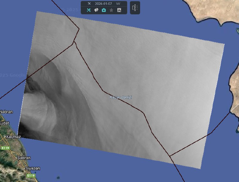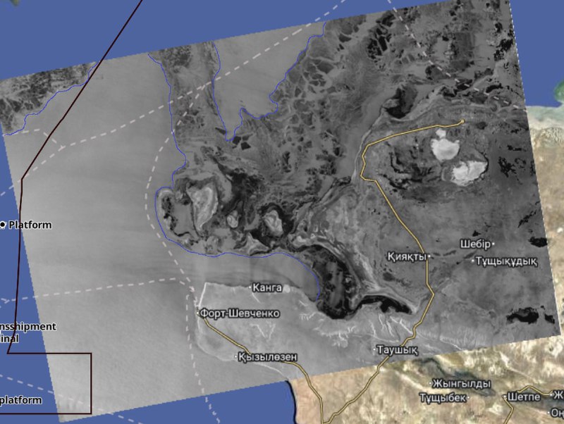 Расположение – в границах российского и казахстанского секторов. Пятен-сликов антропогенного происхождения и естественных нефтепроявлений не обнаружено. В северной части акватории, покрываемой снимком, наблюдается ледовый покров.
