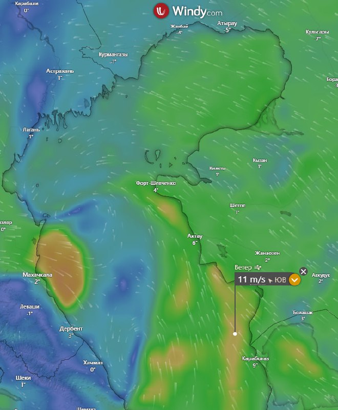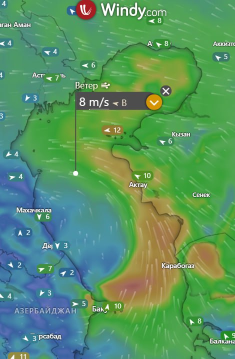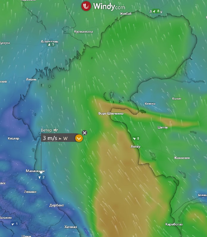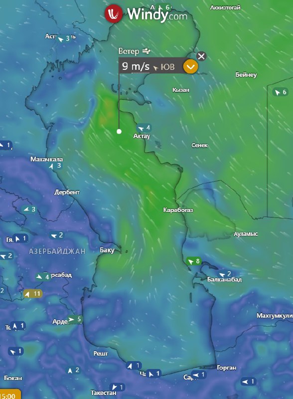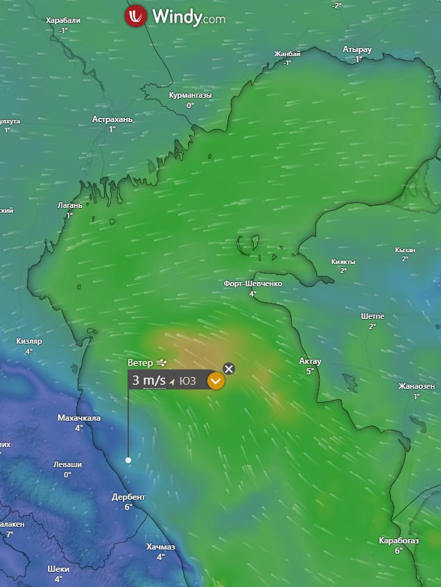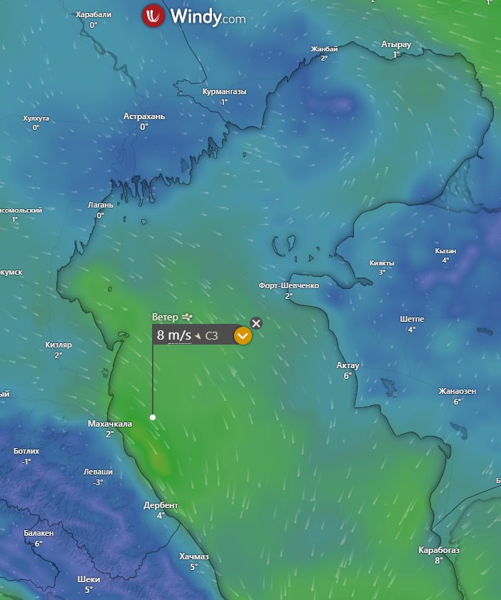 - в акватории южнее г.Дербент - 2-4 м/с.