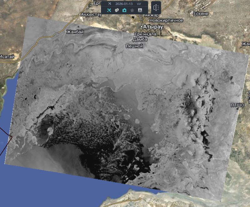 Расположение – в границах казахстанского и российского секторов. На снимке наблюдается ледовый покров разной степени сплоченности.