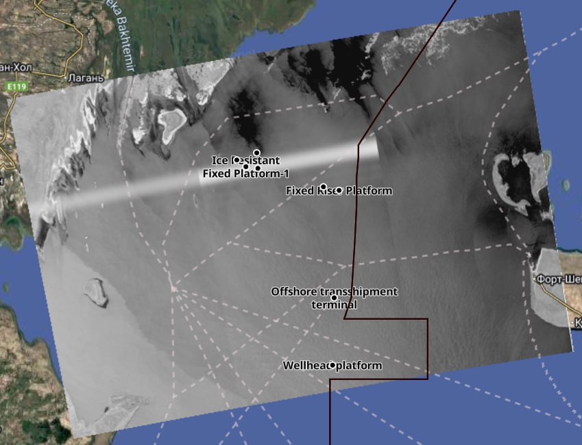 Пятен-сликов антропогенного происхождения и естественных нефтепроявлений не обнаружено. Часть акватории на снимке покрыта льдом. Ветер южный 3-6 м/с.