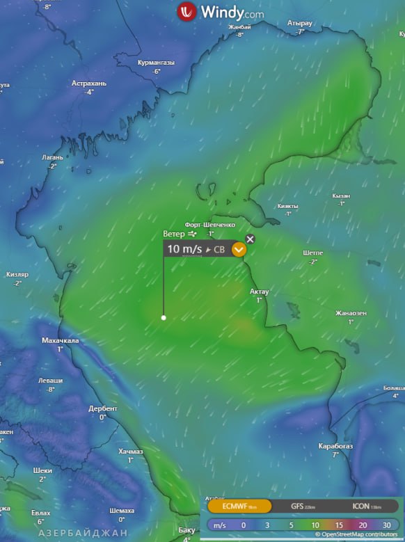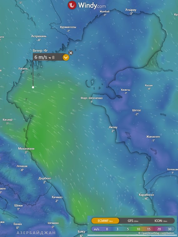 - в азербайджанском секторе - западный и юго-западный 1-3 м/с;