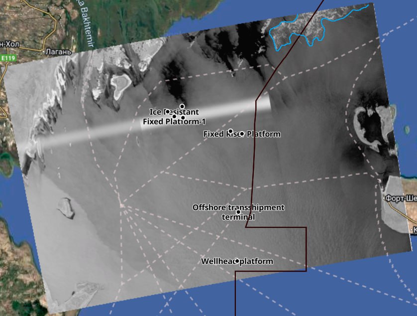 Расположение – в границах российского и казахстанского секторов. Пятен-сликов антропогенного происхождения и естественных нефтепроявлений не обнаружено. Почти на всей территории акватории, покрываемой снимком, наблюдается ледовый покров.